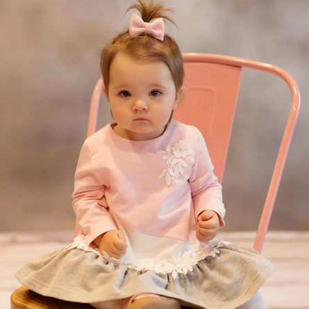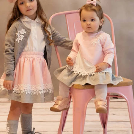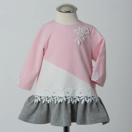 A pretty little dress from Daga with pink and grey contrast. With beautiful floral white trim, this is a cute and cosy dress, sure to keep your little one warm this winter.