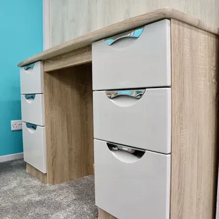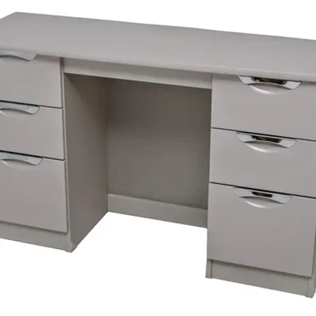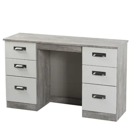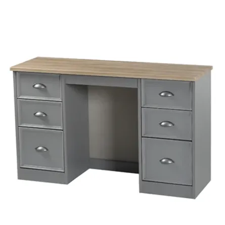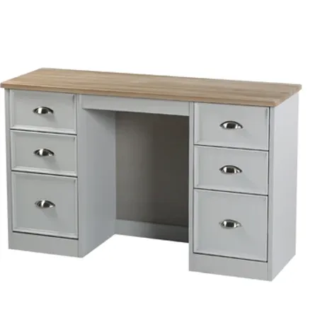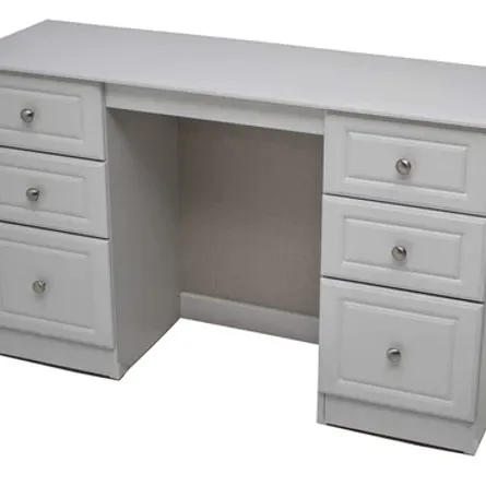Kneehole Vanity Table (Made in Ireland) unit made by Irelands elite furniture manufacturer. A perfect example for a large size modern room. The dressing table which has 6 drawers also space to insert a stool or a chair in the middle. Modern fresh detailing results in a unique dressing table. Quality furniture delivered fully assembled. H:790 X W:1280 X D:400mm