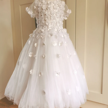 A beautiful stylish little holy communion dress with a daisy design and tulle skirt. Short sleeve and comes with the hoop attached. Ballet length
